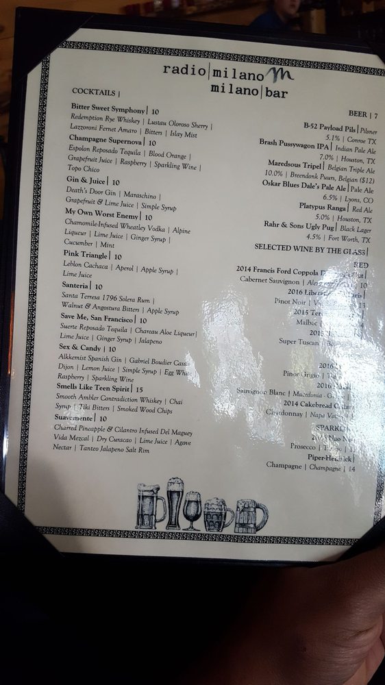 At Radio Milano, we celebrate the vibrant essence of Italian dining in a modern setting. Nestled in Houston, this chic bar attached to the Moran Hotel offers a dynamic space for gatherings, date nights, and casual get-togethers. Guests can indulge in a curated drink menu featuring exquisite cocktails crafted by friendly bartenders. The atmosphere, enhanced by live music and outdoor seating, creates a unique blend of elegance and relaxation. Although vegetarian options are limited, the ambiance promises a delightful experience that captivates both locals and travelers alike. Join us for happy hour and savor the charm of Radio Milano.